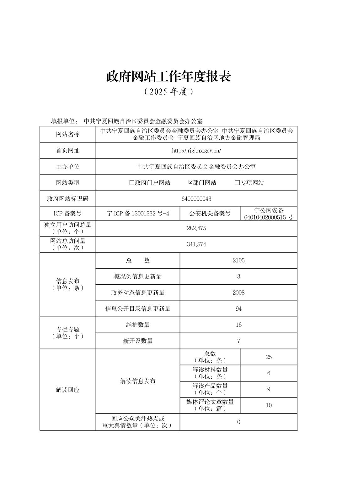 中共宁夏回族自治区委员会金融委员会办公室2025年度政府网站年度工作报表