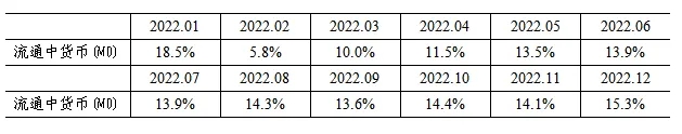 注4:自2022年12月起,“流通中货币(M0)”含流通中数字人民币。12月末流通中数字人民币余额为136.1亿元。修订后,2022年各月末M1、M2增速无明显变化。修订后M0增速如下: