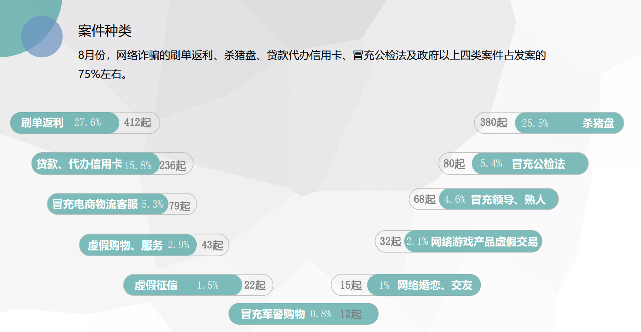 9月2日,记者从宁夏公安厅召开的新闻通气会上获悉,8月份全区共发电信网络诈骗案件1493起,网络诈骗占比87.6%,20岁至50岁的中青年占受害人群的98%。连续多月,区内女性群体遭受电信网络诈骗比例远高于男性,诈骗分子已把女性列为首选目标之一。公安机关将持续开展超常规宣传,充分发挥联席办各部门、社会各界和人民群众的力量,打好反诈人民战争。
