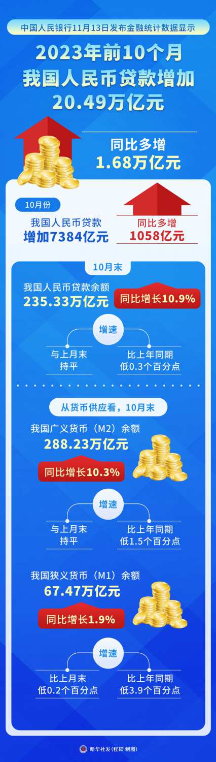 从货币供应看,10月末,我国广义货币(M2)余额288.23万亿元,同比增长10.3%,增速与上月末持平,比上年同期低1.5个百分点;狭义货币(M1)余额67.47万亿元,同比增长1.9%,增速分别比上月末和上年同期低0.2个和3.9个百分点。